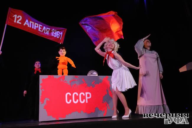 Как всегда, блеснула на фестивале капустников любимая всеми «куколка». Ее выступление, явившее залу историю появления на свет первого космонавта Земли, его путь к заветной цели, сам полет и последующее триумфальное шествие по всему миру, вплоть до знакомства с Мерилин Монро, ставшей вдруг самой обаятельной пионеркой, – это все, как я поняла, плод фантазии Салавата Бикмиева, потрясающий капустник по сценарию которого к 10-летию ТЮЗа в пору его работы в муниципальном театре я помню и по сию пору. Теперь, перейдя работать в БГТК, Салават продолжил свои опыты в написании такого рода текстов.