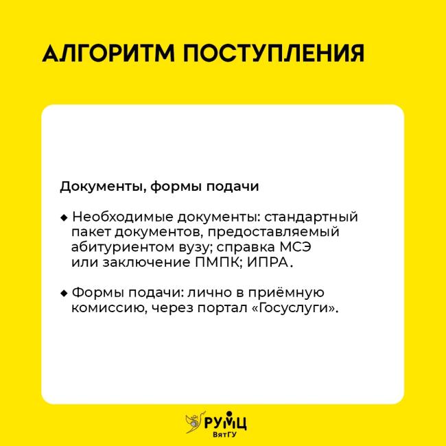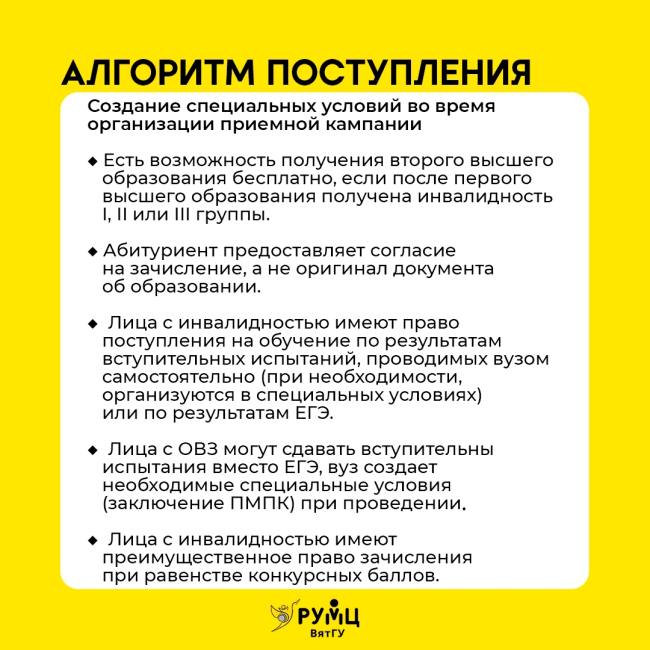 С 2017 года в ВятГУ действует Ресурсный учебно-методический центр по обучению инвалидов и лиц с ОВЗ. За эти годы он стал одним из крупнейших в Приволжском федеральном округе, объединив 27 вузов-партнеров, готовых принимать на обучение студентов с различными нарушениями здоровья.