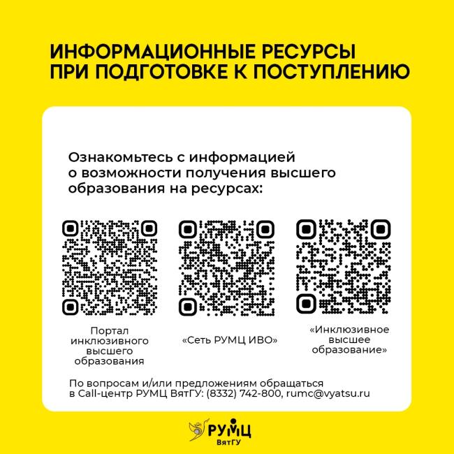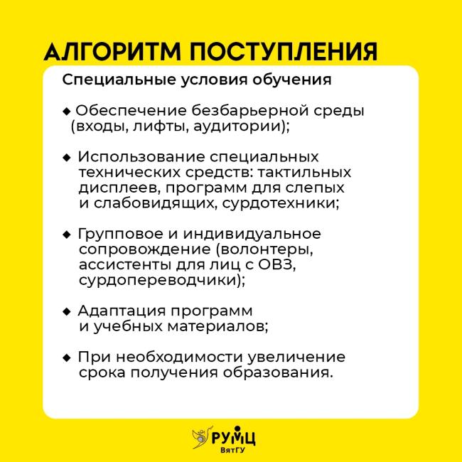 Вятский государственный университет создал все условия для комфортного обучения студентов с различными нозологиями. Над доступностью высшего инклюзивного образования работает команда опытных специалистов, готовых развивать профессиональные навыки по обучению, сопровождению и трудоустройству студентов, оказывать консультационную поддержку сотрудникам, обучающимся, абитуриентам и их родителям.