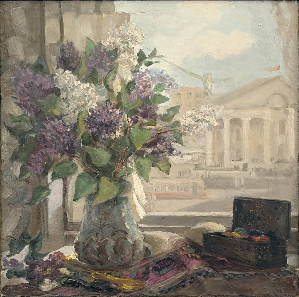 Государственный заказ на масштабные полотна – «Вручение Красного знамени Башкирской дивизии», «Ленин на встрече с социал-демократами Уфы» и другие – становится трудновыполнимым, поскольку Константин Иванович работал все в той же маленькой полутемной комнатке с видом на крыльцо. В архиве сохранилось обращение художника к руководству республики от 1948 года с просьбой выделить мастерскую для завершения начатых работ, эскизы которых уже были утверждены. К тому времени его болезнь стала прогрессировать, и, чтобы не подвергать опасности заражения близких, в 1953 году Константин Иванович переехал жить к сестре в дом, на улицу Ленина, 13. Напротив этого дома в то время началось возведение кинотеатра «Родина». Там, добавлю попутно, и была написана картина с изображением строящегося кинотеатра (на нижнем фото).