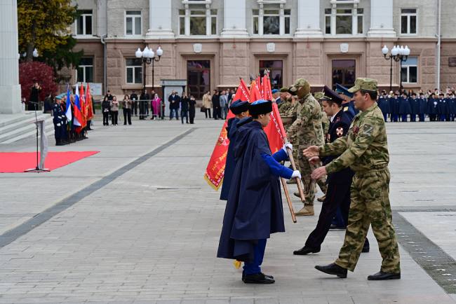 Затем наступил трогательный и значимый момент церемонии — передача командирам шаймуратовских классов копий знамени 112-й Башкавдивизии. После чего ребята исполнили свой гимн – песню «Шаймуратов-генерал» и прошли по площади торжественным маршем.