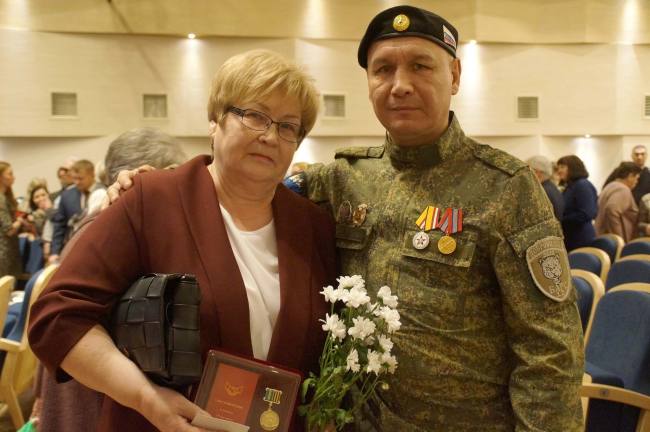 В этот вечер чествовали очень многих: медали вручались и семьям Героев России, семьям защитников Отечества, тем, кто помогает СВО – волонтерам, медикам. Звучали поздравления, а также слова признательности активистам комитета, которые неутомимо помогают всем нуждающимся. Самым юным награжденным – ему вручили медаль – был 10-летний Давид Зинатуллин, который собрал уже не одну посылку для наших воинов на передовой, отказывая себе во многих детских удовольствиях. Был в этот вечер и приятный сюрприз: на сцену поднялись волонтеры Валерий Петрович и Наталья Васильевна Аллабердины из Благовещенска, которые в этот день отмечали серебряный юбилей своей свадьбы. Участник СВО Валерий Аллабердин вручил своей супруге медаль «Жене участника СВО», после чего чета закружилась под звуки вальса.