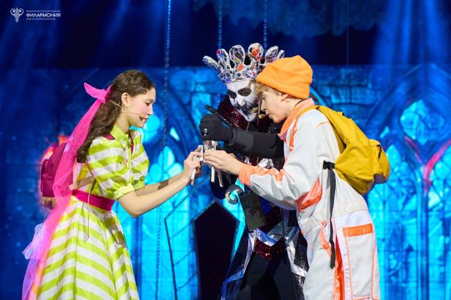 На сцене Большого зала ребят ждал сюрприз – новогоднее представление «Блогер в царстве Кощея». Яркие декорации, световые проекции, шикарные костюмы героев, великолепная игра артистов, музыкальное сопровождение – все это вызвало неподдельное восхищение и восторг у зрителей! Юные слушатели и их родители отметили, что сказка очень современная, интерактивная, поучительная, добрая и интересная.
